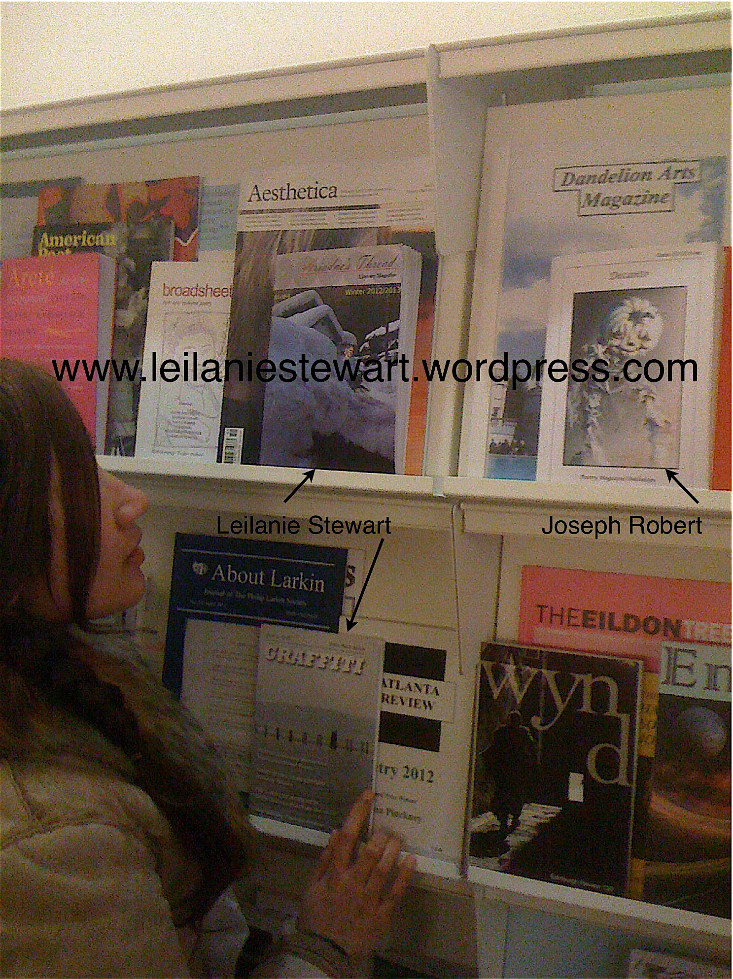 Perhaps it is time for a new definition for the idiom ‘on the shelf’. If this is my shelf life, may it long live beyond its expiry date! Joseph Robert and I were browsing at the Southbank poetry library last week (as we often do) and we noticed that our most recent publications were side by side on display. It just so happened that Ariadne’s Thread under ‘A’ and Decanto on the next shelf filed under ‘D’ worked out to be side by side next to each other. Somebody (a customer, no doubt) had misfiled Graffiti in the ‘A’ section on the shelf below Ariadne’s Thread. Usually such things bother me, but in this case, I saw it as a prime opportunity for a photo… or rather, Joseph did!