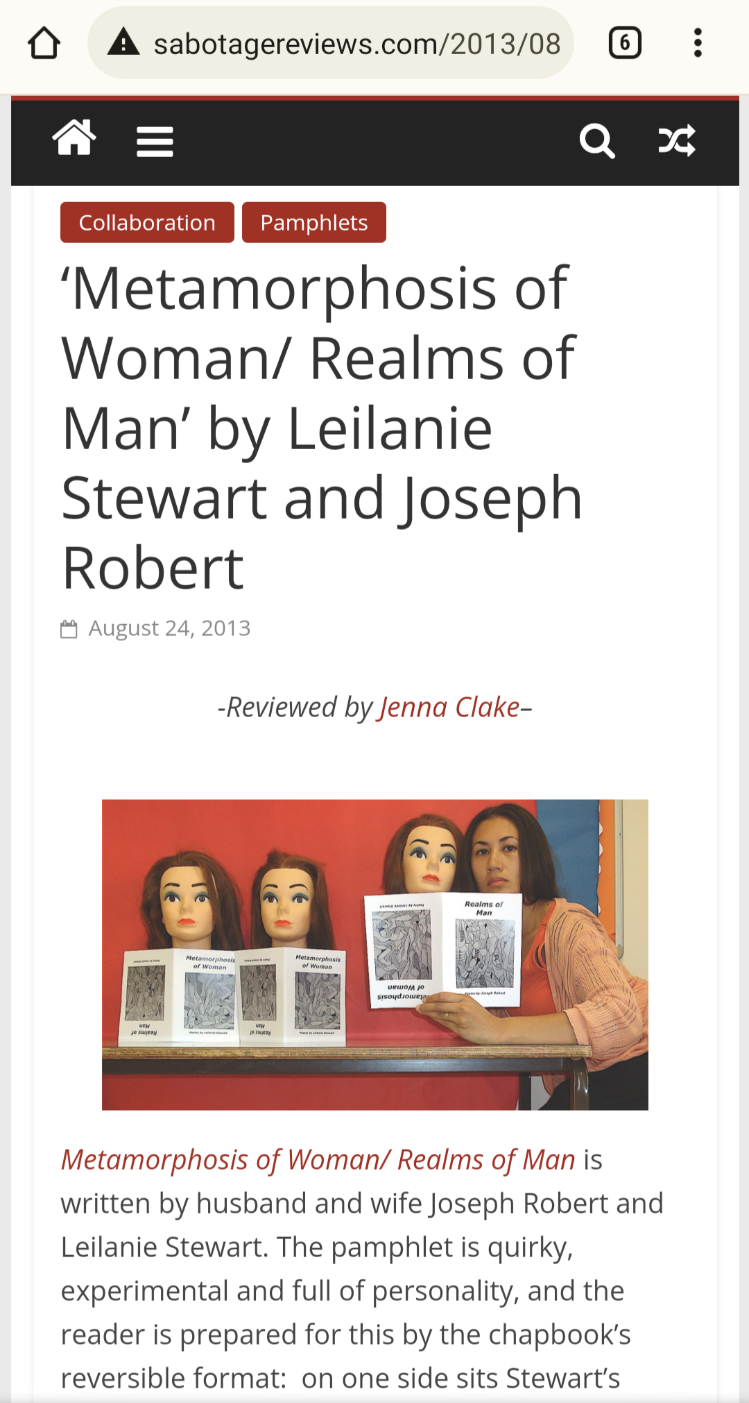This month Joseph Robert and I had our joint collection, Realms of Man/ Metamorphosis of Woman, reviewed in Sabotage. The incisive and detailed review by Jenna Clake concludes with: “It is evident why the poets have chosen to self-publish collaboratively: their work shares enough similarities to make the pamphlet seem unified, without one over-shadowing the other or the work blending into one undefinable collection. Metamorphosis of Woman/ Realms of Man is a largely successful pamphlet, and it is entertaining at the very least.”