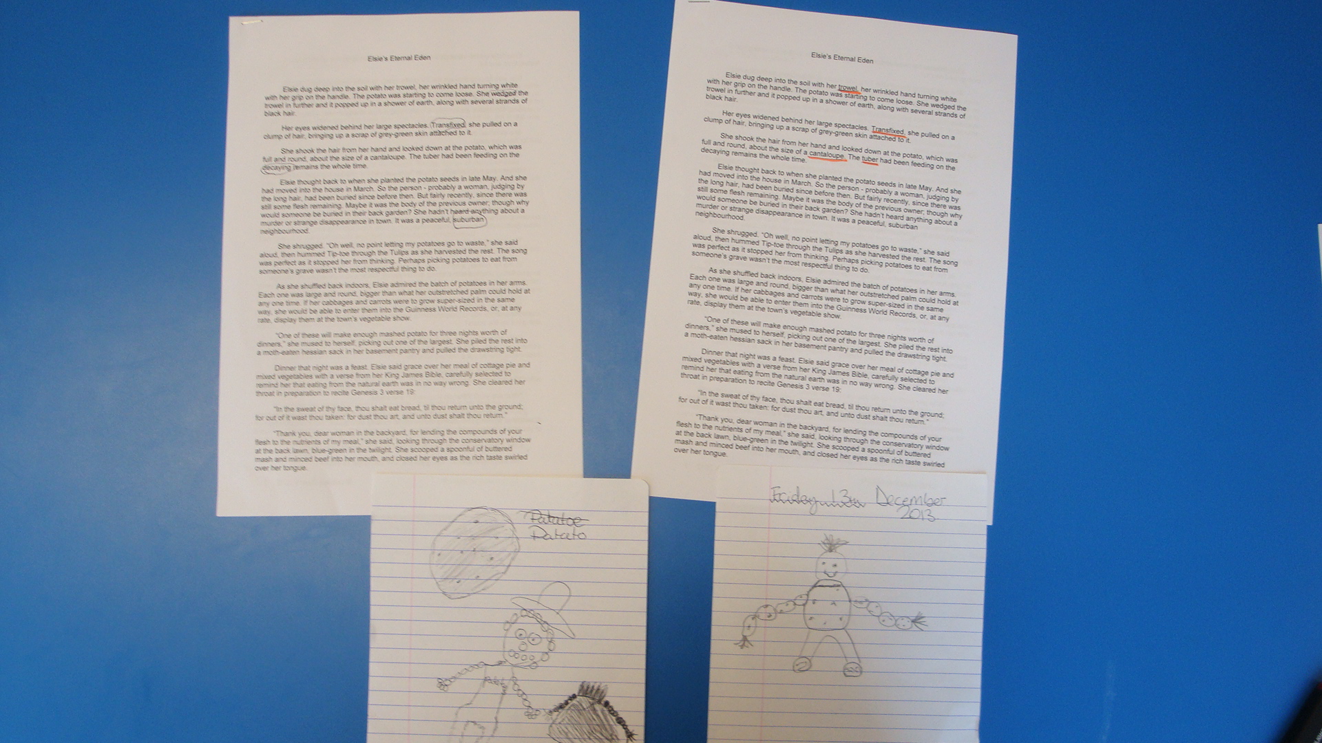 My story, Elsie’s Eternal Eden, which was published in The Crazy Oik magazine (The Penniless Press, 2012) proved to be a good choice for vocabulary building activities in my recent Creative Writing workshop with 12-13 year old pupils. Unlike my usual scheduled Creative Writing workshops, I did a couple of recent sessions in their English classes, to tie in with what they’ve been studying as part of their curriculum. I chose to focus on the description of the otherworldly creature in my story, when it first appears to the protagonist, Elsie. The students drew a picture of how they imagined it as I read the paragraph, exploring words such as ‘hessian’ and ‘gnarled’… part of the reason why I found that teaching phonics to Japanese children (when I taught English in Japan) didn’t work well!