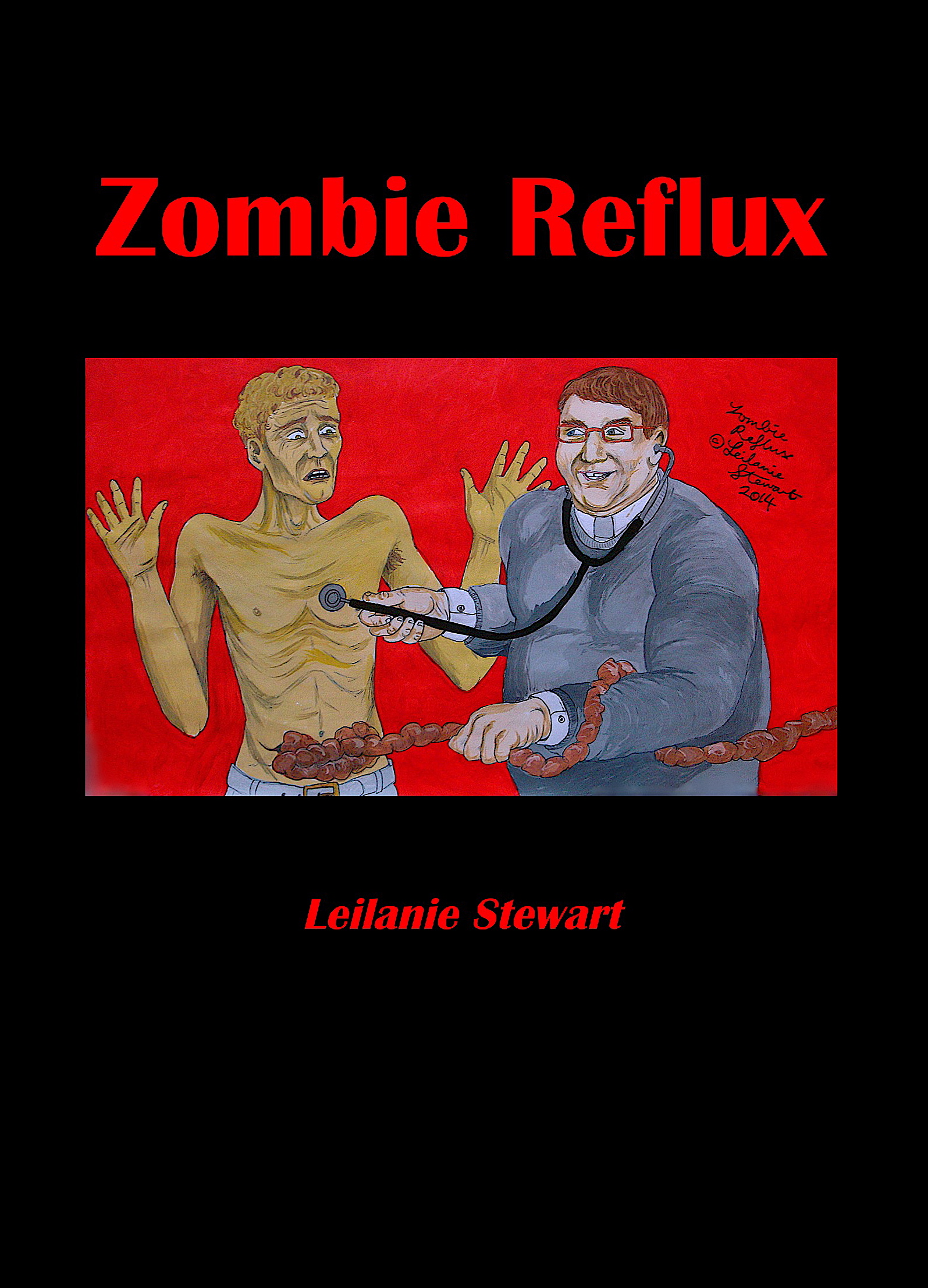 This month my new novella, Zombie Reflux, is out in print and as an ebook. The preview looks a tad blurry, but rest assured the actual cover is fine. Here’s the artwork, as I orginally designed it: