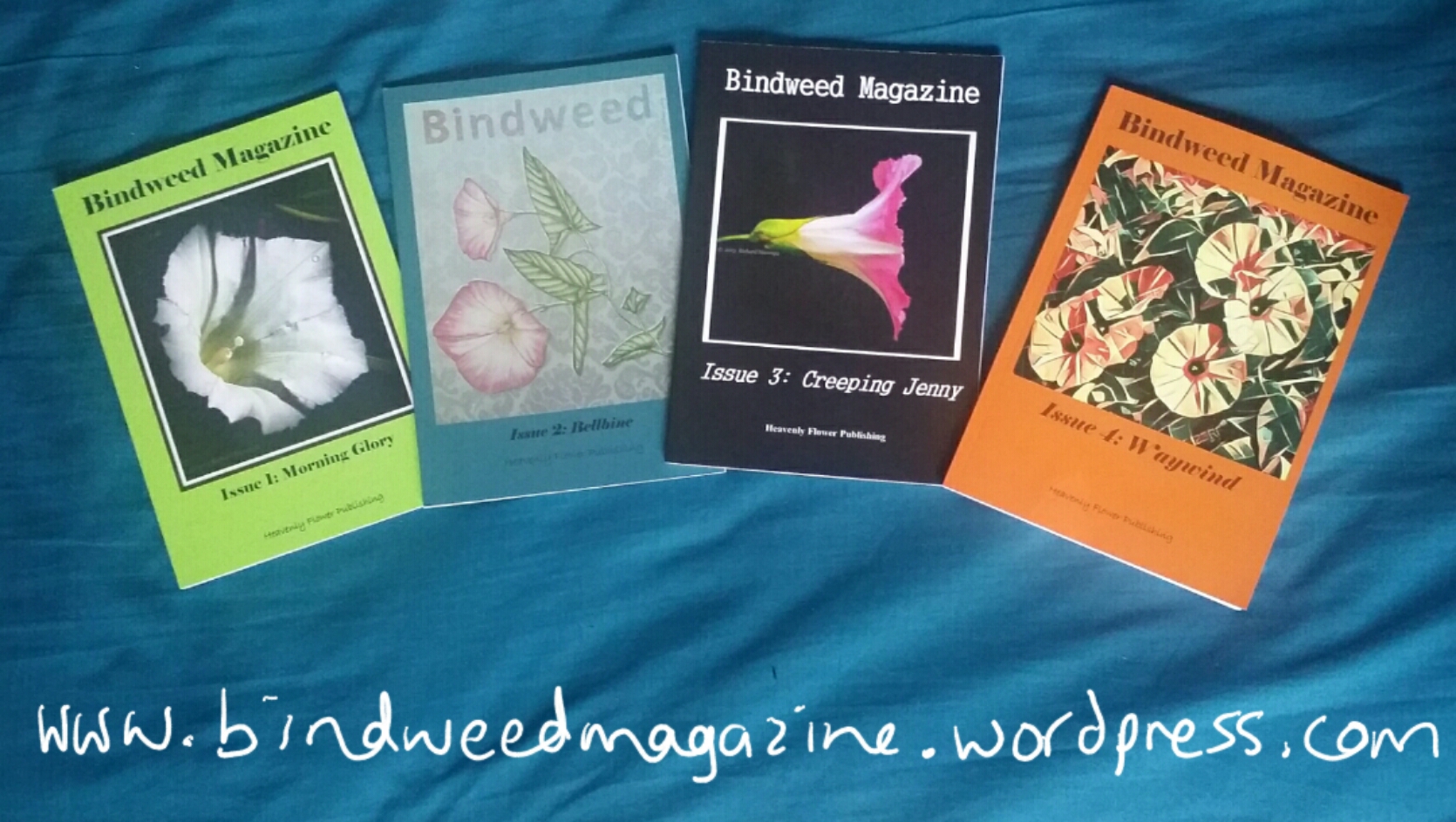 As many of you may know, in addition to writing and promoting my own fiction and poetry, I’m also the Editor-in-Chief of Bindweed Magazine, which celebrated its 1 year birthday anniversary on 3rd April this year. Bindweed Magazine is truly a labour of love; I receive no government/Arts council funding for my magazine. It’s entirely independent. I read submissions for free and with the help of my writer hubby, Joseph Robert, select poetry and fiction that we feel has literary merit to publish – online every 4 days and in a print anthology 4 times a year.