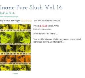 Joseph Robert and I are jointly published in Inane Pure Slush Volume 14 today. This is our third joint publication since our reversible poetry chapbook, Realms of Man/ Metamorphosis of Woman was published in 2012 by Meandi Books and more of our poetry appeared in Mudjob Magazine in 2013 (Joseph Robert here and Leilanie Stewart here). This time, however, our joint publication is fiction not poetry.