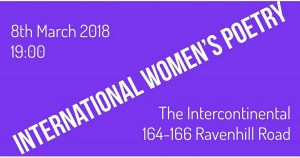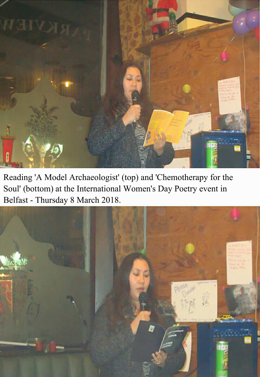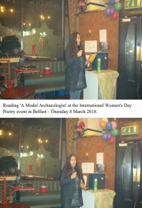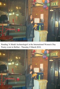 Yesterday, to celebrate International Women’s Day, I read a few poems from my collections, A Model Archaeologist, Chemotherapy for the Soul, Toebirds & Woodlice and Metamorphosis of Woman/Realms of Man at the International Women’s Day Poetry event in Belfast. The event saw 12 poets (myself included) reading work at the Intercontinental pub.