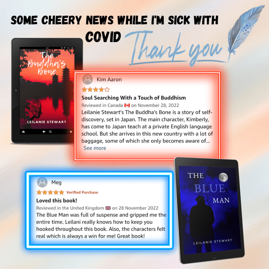 Anyway, these lovely reviews came at a great time as a pick-me-up yesterday: a 5 star review for The Blue Man in the UK and a 4 star review for The Buddha’s Bone in Canada. If you’re reading this, thank you for those. I know reviews are aimed at readers, but in this case they brought me some much-needed cheer.