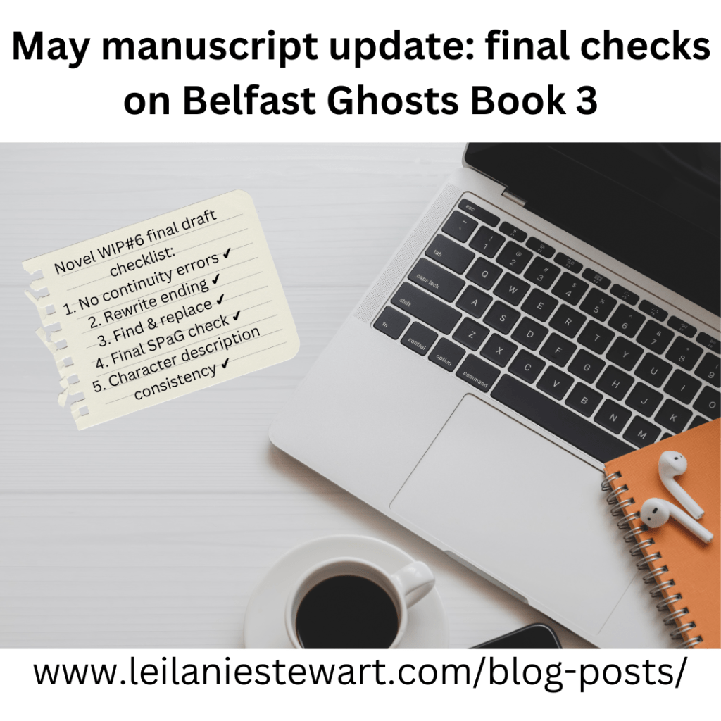 I also need to make the ending finish with a bang, not a fizzle. When I read through the current draft, I was underwhelmed by my own ending. It doesn’t need much work, just extended a bit to tie in some info from earlier in the story. This manuscript will become Book 3 in my Belfast Ghosts trilogy. I was happy with the ending of both Book 1: The Blue Man and Book 2: The Fairy Lights when I wrote the final drafts, and Book 3 has a lot to live up to as it will complete the trilogy.