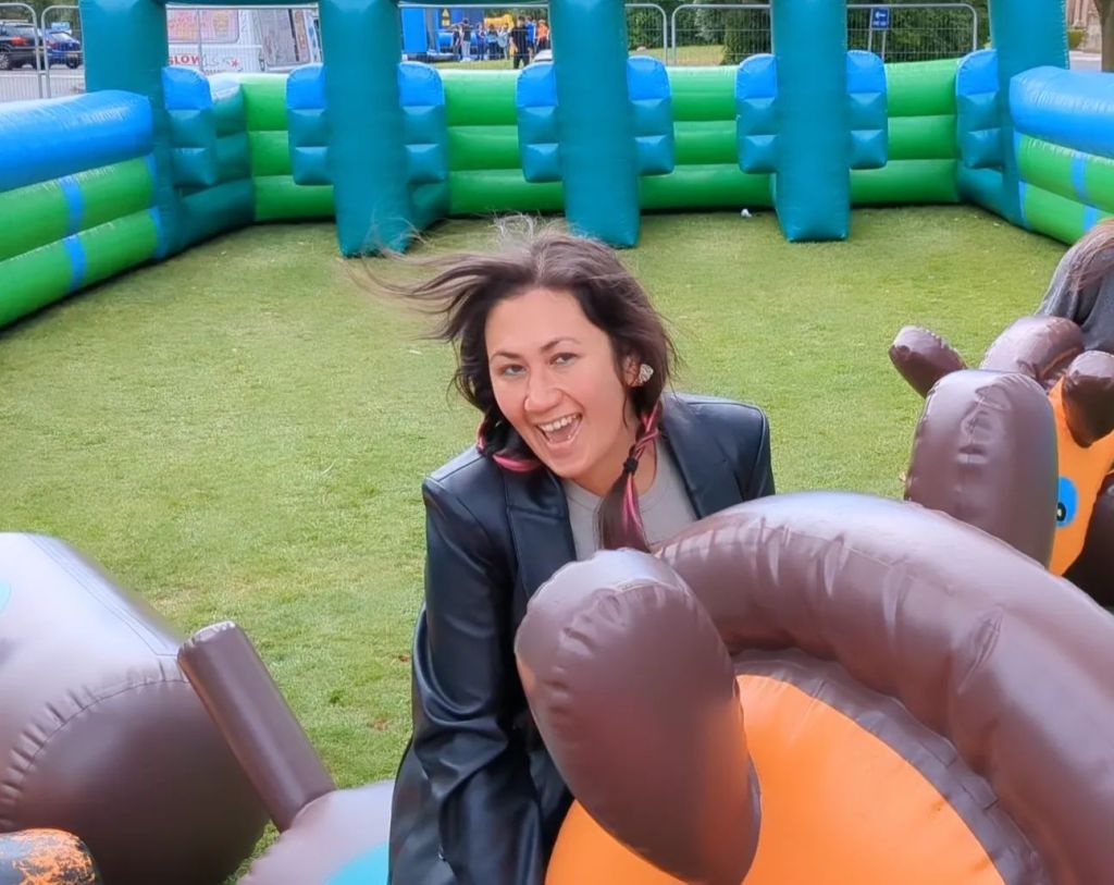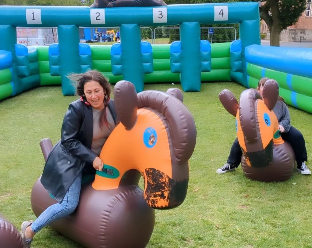 Well, it’s officially July, but you wouldn’t know it from the weather. School is out for summer here in Northern Ireland and that means I have seven weeks off from the day job. Does that mean more writing time? We’ll see. The little dude is also off for summer so we’ll be having lots of day trips and getting involved in kiddy activities. Speaking of which, check out the silliness in these photos. I couldn’t resist the lure of an inflatable horse race, even though I wasn’t dressed suitably for such horseplay. At this point in my life it’s safe to say I will never grow up!