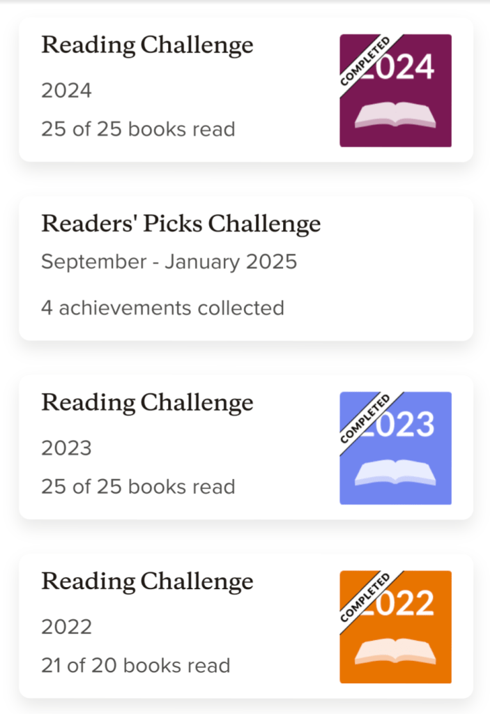 This year I’ve set another Goodreads challenge of 25 books for 2025. Such a goal has been manageable for the previous two years, so it’s something I think I can achieve again. I use my author account for this challenge, and the books are either related to writing research, books related to GCSE English at work, or those I’ve been reading in the library where I work part-time (I don’t spend all my time reading books in the library, I promise – ahem!)