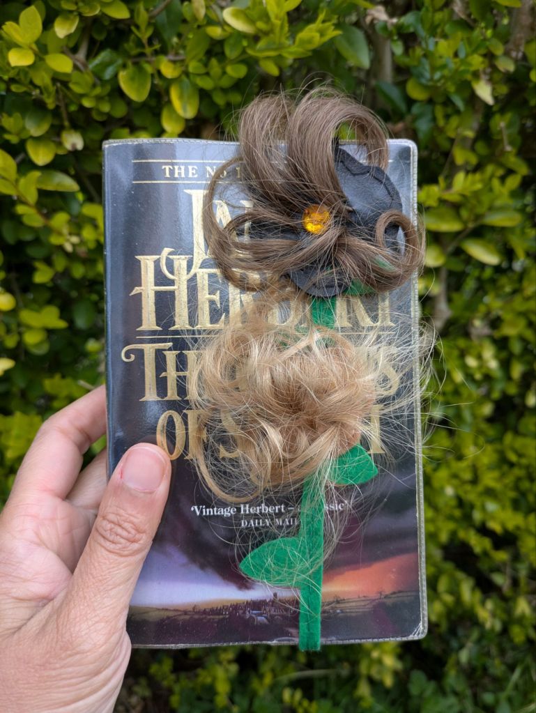 I sewed the locks onto felt material and faux leather fabric, then used fabric glue to bind them, and the curls give a rather flower-like appearance, which is why I added the green felt stem for aesthetic reasons. The whole thing is attached to black elastic, which fits most of the books I read, regardless of size or width. This way I can bring a reminder of him with me wherever I go; and as a ‘twiddler’, I can play with the curls while I read, rather than twiddling my own hair.