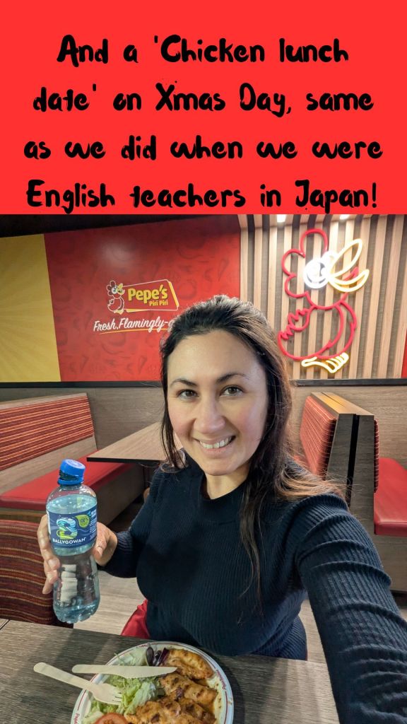On Christmas Day, we kept up our family tradition of a ‘chicken lunch date’, which we started while living and working in Japan. Did you know that my hubby (author Joseph Robert) and I met in Japan while we were both English teachers? Well, now you do. Since Christmas Day in Japan isn’t a holiday like it is in the UK and Ireland, we were always working on that day. In Japan, Christmas Day is a romantic time for couples, not a family day, and generally speaking, couples tend to go to KFC and share a chicken bucket (read this BBC article if you don’t believe me). My then-boyfriend, now-hubby and I celebrated Christmas Day in KFC when we were in Japan amidst an atmosphere similar to Valentine’s Day here. As KFC isn’t open in the UK on Crimbo Day, we keep up our tradition at other chicken restaurants that are open on December 25th (pictured above).