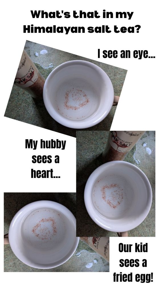 The picture above shows one such byproduct of my imagination. While doing one of my 24 hour intermittent fasting sessions a couple of days ago, I made myself a Himalayan salt tea; it staves off leg cramps and headaches during ketosis by replacing electrolytes. Anyway, after I sprinkled the salt in my mug, I then added the boiled water and watched the salt disperse in the strangest pattern. As a horror fan, it seemed to me to form a rather intense eye staring up at me from the bottom of the mug. Creepy.