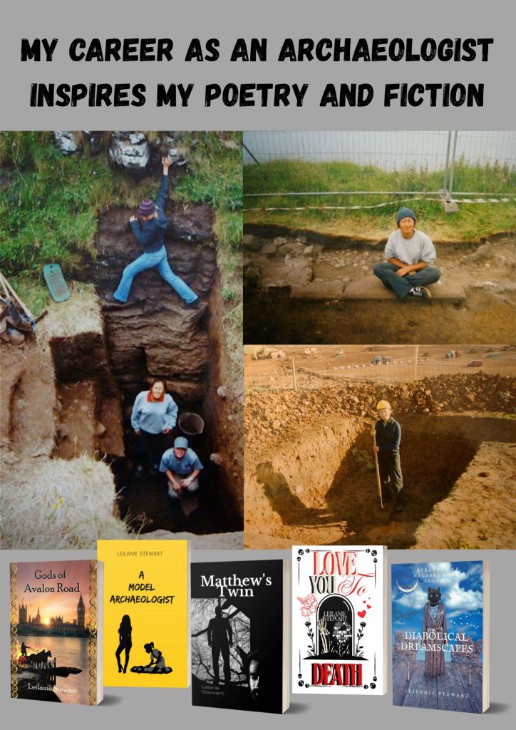 I studied Archaeology and Palaeoecology at Queen’s University Belfast and began working as a field archaeologist after graduation. Although I was on a writing hiatus at this point, having archived my children’s fantasy novel manuscript, my experience of working in archaeology fuelled my imagination. Although I no longer work as an archaeologist, these days I draw upon my training and experience by incorporating elements of archaeology into my poetry, short story collections and novels (as pictured below).