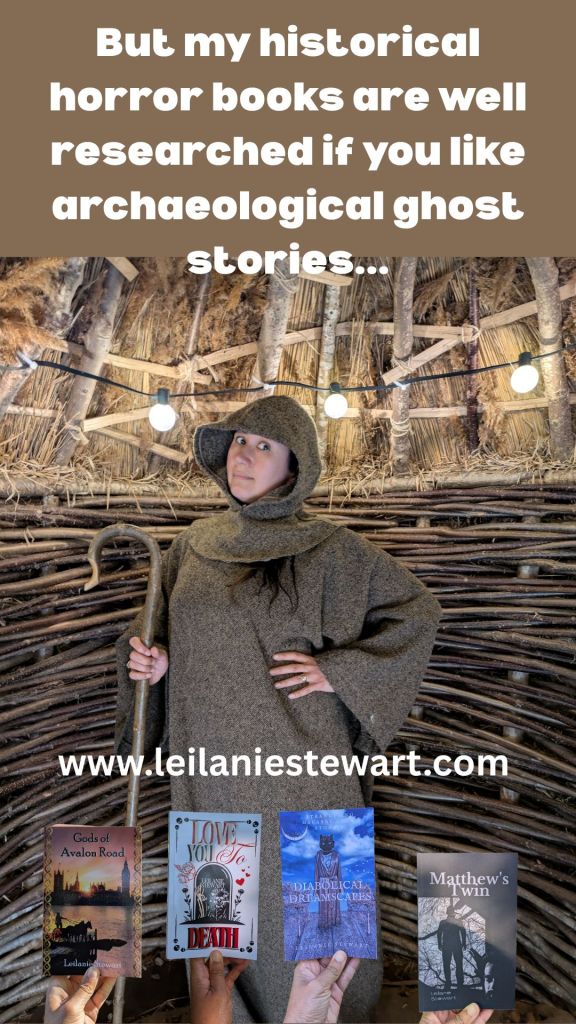 Well, my historical acting leaves much room for improvement – I can’t help but be quite hammy and find it hard to be serious sometimes – but I assure you my historical horror novels are quite different. I try to be as accurate as I can with my research to give my books more authenticity. Even though I primarily write ghost stories, giving them a grounding with the archaeological details adds a level of realism that hopefully helps readers keep up the suspension of disbelief. Four of my books: Gods of Avalon Road, Diabolical Dreamscapes, Matthew’s Twin and Love you to Death, contain archaeological elements, if you’re interested.