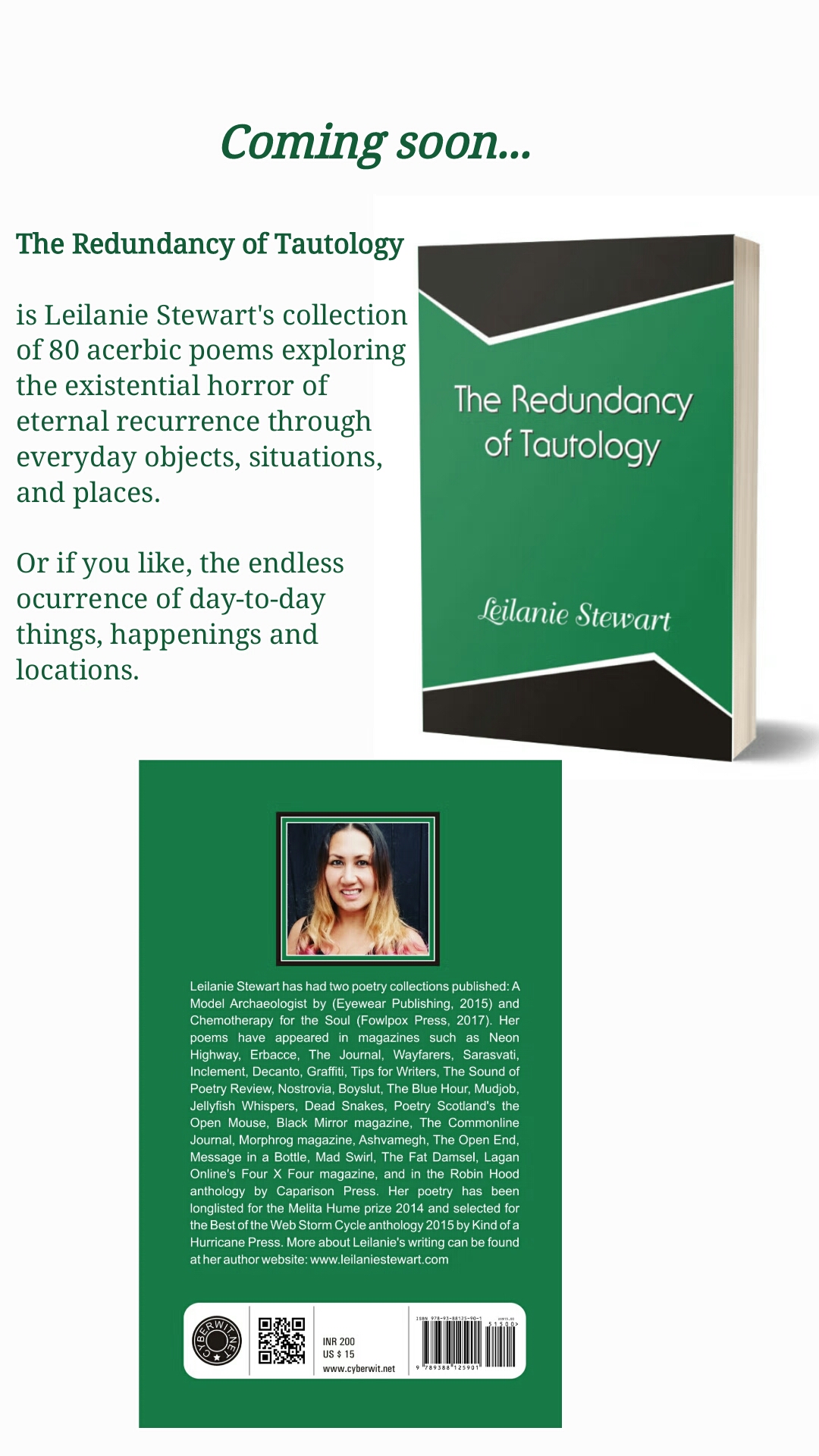 Cover reveal! Finally I can share my big news. My third poetry collection, The Redundancy of Tautology, is forthcoming from Cyberwit Publishing. This is exciting news as it marks the publication of my first full book of poetry: A Model Archaeologist (Eyewear Publishing, 2015) and Chemotherapy for the Soul (Fowlpox Press, 2017) were both chapbooks.
